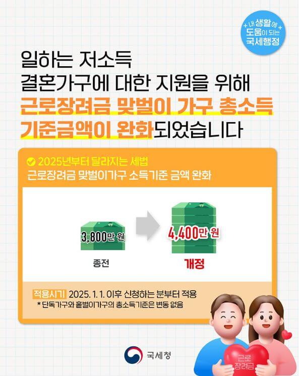 1) 맞벌이 가구: 연간 총 소득 4,400만원 이하 (기존 3,800만원에서 상향개정)