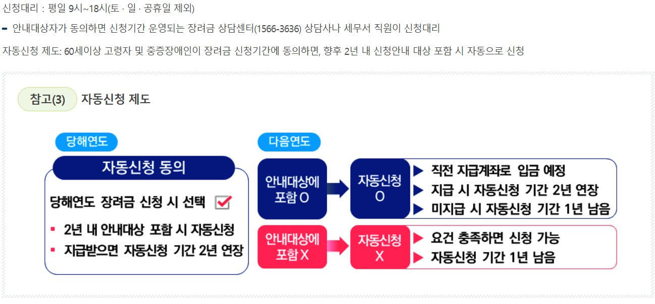 5) 고령 신청자의 경우 본인 동의를 통하여 신청 대리를 하거나 자동신청이 되는 등 근로장려금 신청에 직, 간접적으로 도움을 받을 수 있습니다.